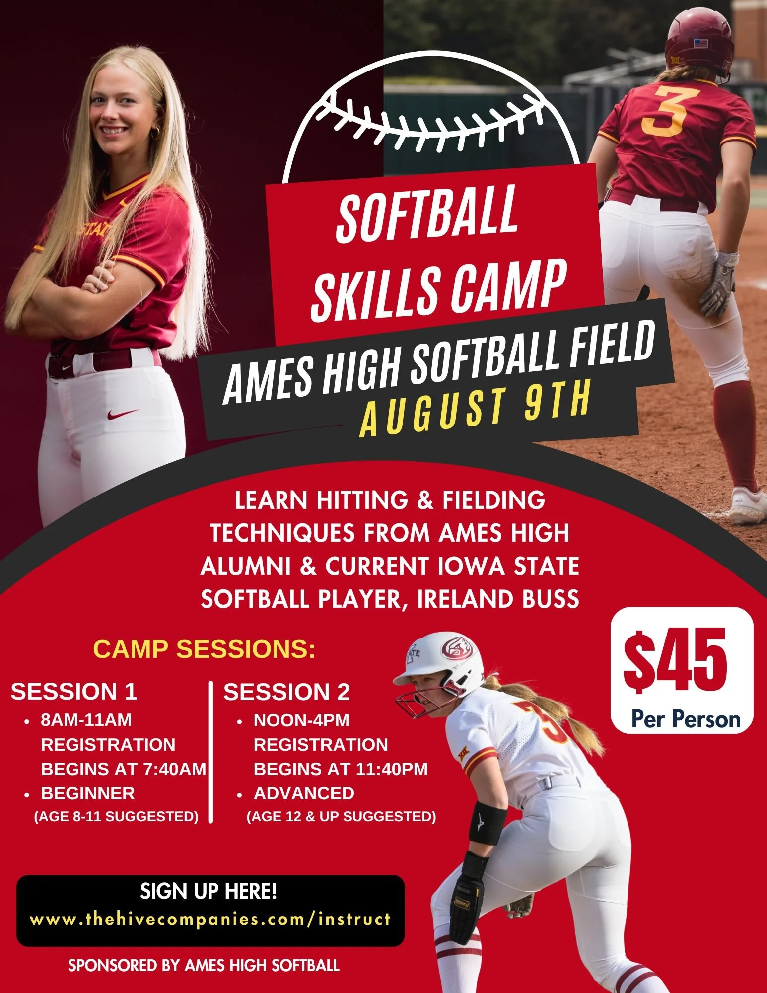 Each camp entry includes a t-shirt, snack and instruction from Ames High Alum and current Iowa State softball player, Ireland Buss and staff.